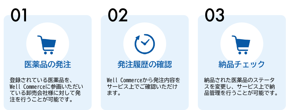 複数の卸売会社の医薬品情報を一元化し、発注から納品管理までをオンラインで行うことができます。